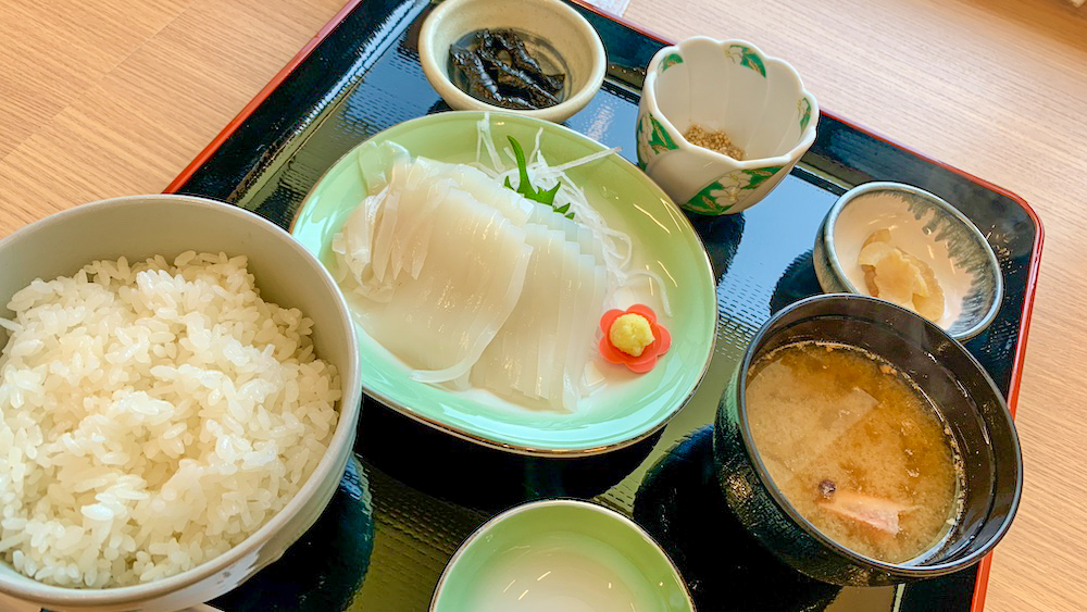 積丹岬にある「お食事処 鱗晃」さん。ウニ丼で有名なお店ですが、私たちは「イカ刺身定食」と「甘エビ刺身定食」を注文。