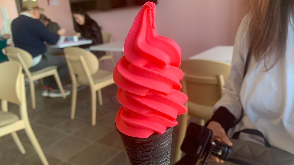 平日ではありましたが、多くの観光客に溢れていました。私たちは「白桃ソフトクリーム」を注文。ピンク色のたらこ色で衝撃的です。