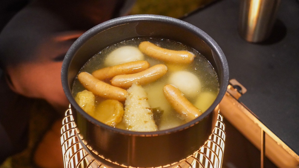 寒さが予想されたのでスノーピークのメッシュシェルターを張りました。全面にメッシュが配置されているので、日中は開放的に過ごすことができ汎用性が高く便利です。
